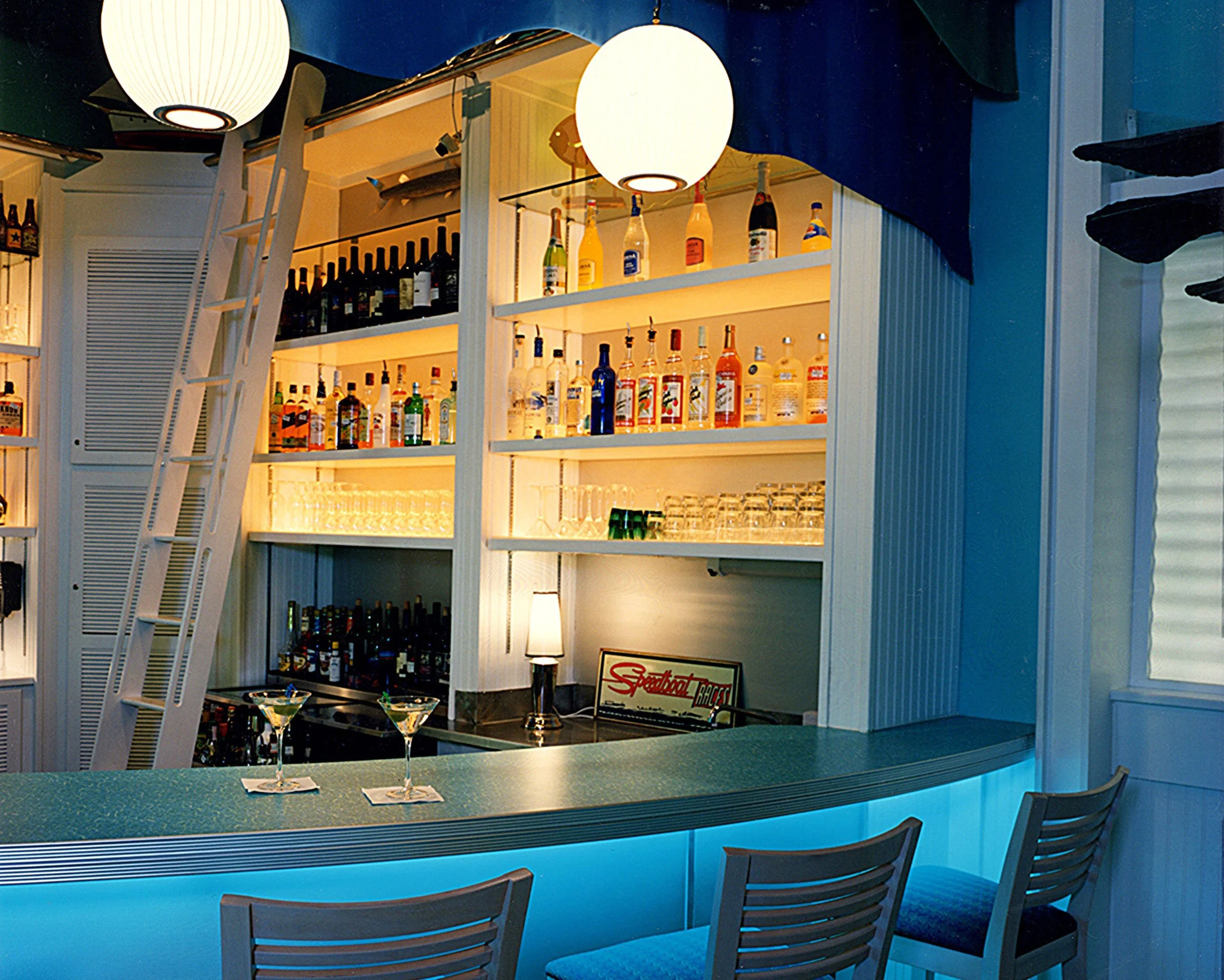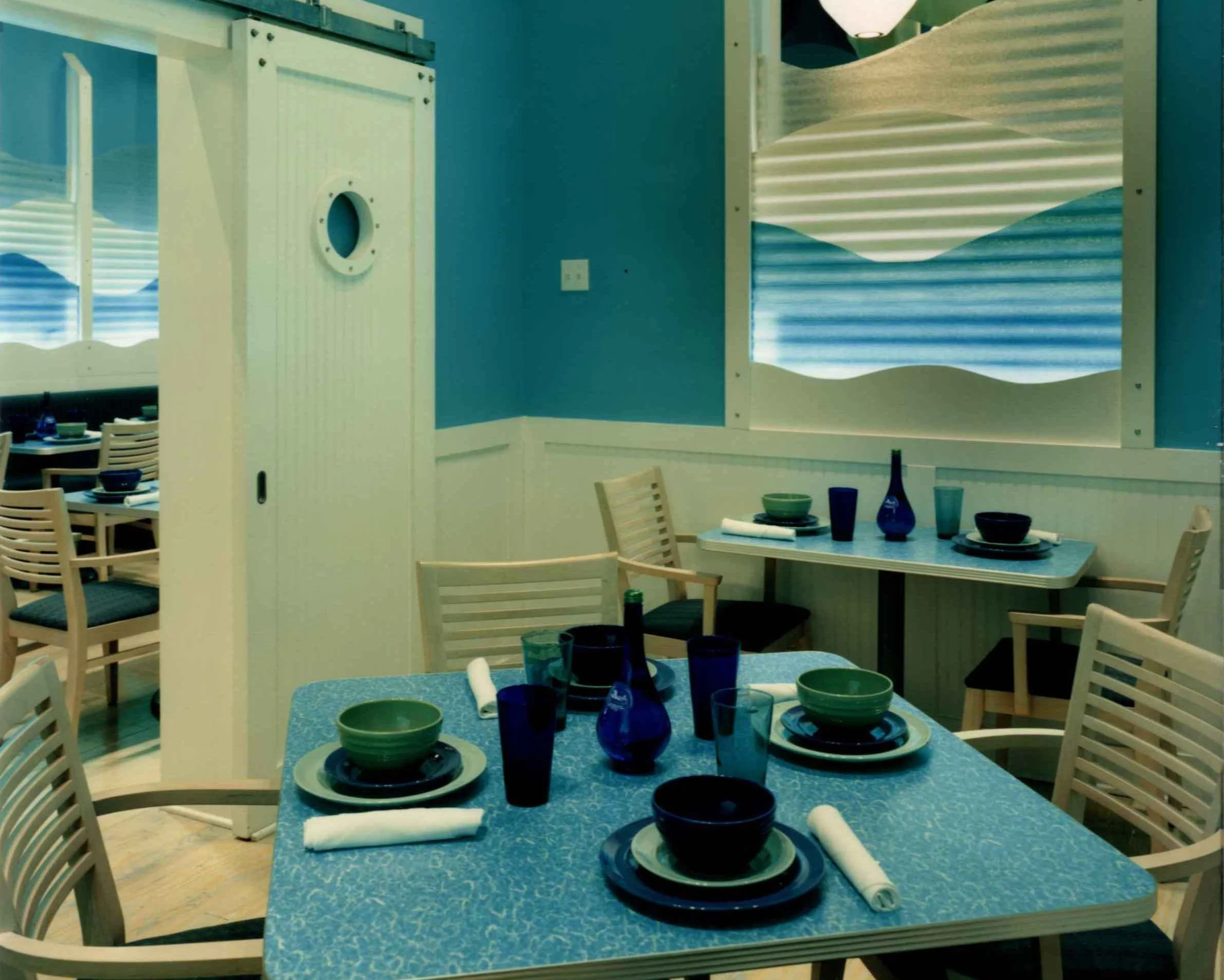 As guests moved through the café, they entered the underwater-themed world of the NOFO Restaurant. Here, fabric panels undulated from the ceiling in wave-like patterns, echoing the ocean's motion and complementing the large, galvanized metal fish that appeared to swim overhead. The bar area invited visitors to relax with a cool cocktail, surrounded by an ambiance bathed in varying shades of blue, teal, and green, enhancing the overall immersive experience.
