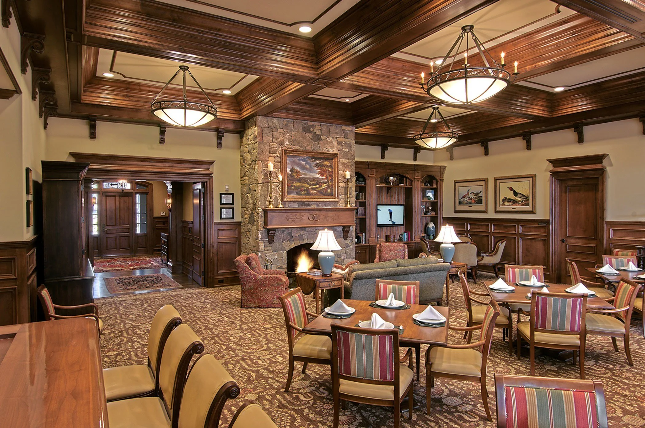 Located in a peaceful area of Chatham County, Old Chatham is perfectly positioned between Durham, Chapel Hill, and Raleigh. The club’s design evokes the atmosphere of a classic golf club and course, paying tribute to the sport’s history and traditions. The locker room features hand-carved wooden lockers inspired by those at Seminole, creating a timeless elegance. Comfortable tacked leather benches, plush club chairs, and a welcoming stone fireplace offer members a cozy retreat to relax after their round.